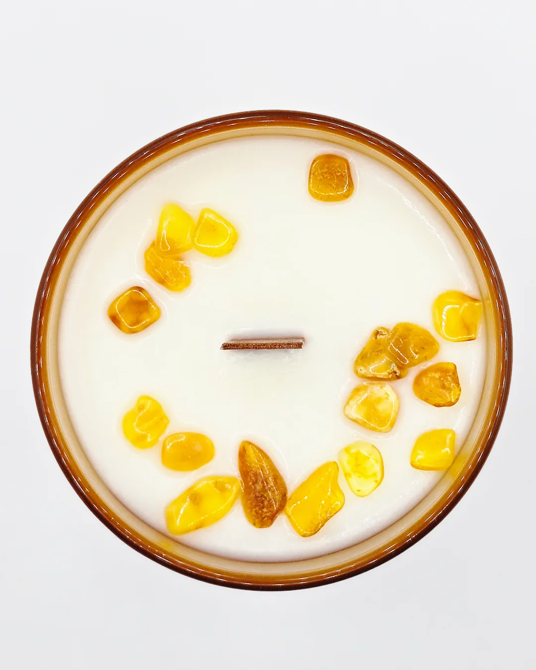 This hand-poured soy candle blends amber and sweet orange with natural amber stones and a wooden wick, creating a soothing, positive atmosphere and elegant decor.