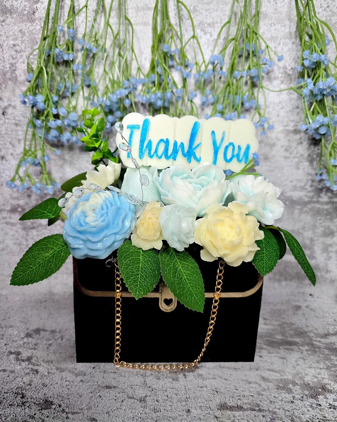This white and blue soy wax bouquet is a sophisticated and eco-friendly way to say thank you. It offers lasting beauty and a delightful fragrance that can be enjoyed long after the initial sentiment is expressed. Show your gratitude in a truly memorable way with this unique floral arrangement.